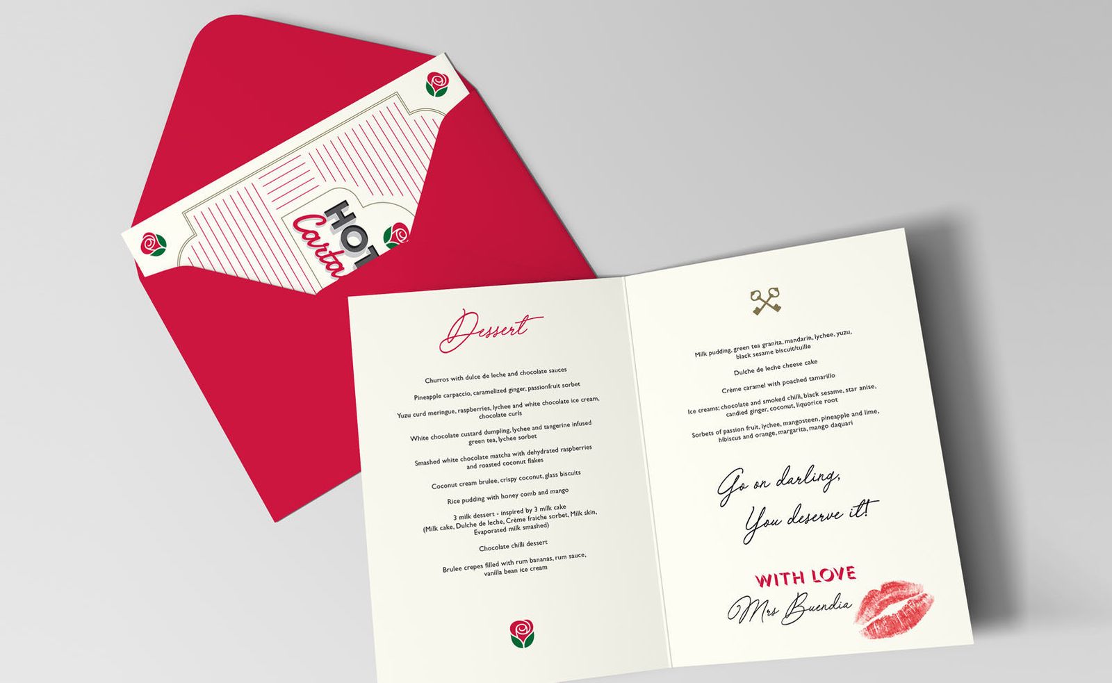 The end result was an eclectic, first of its kind, hedonistic brand identity rolled out uniquely and with meticulous consideration of the brand and its story, across as series of collaterals including; drink cabinet bar tab keychains, a love letter desert menu and an authentic book bill fold.